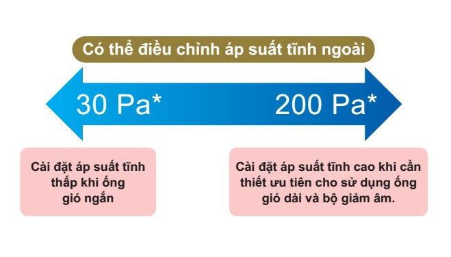 Trong khi lắp đặt hoặc ngay cả khi áp suất tĩnh ngoài thay đổi do sự thay đổi đường đi của ống gió, lưu lượng gió có thể được tự động điều chỉnh trong giới hạn áp suất tĩnh bên ngoài của dàn lạnh