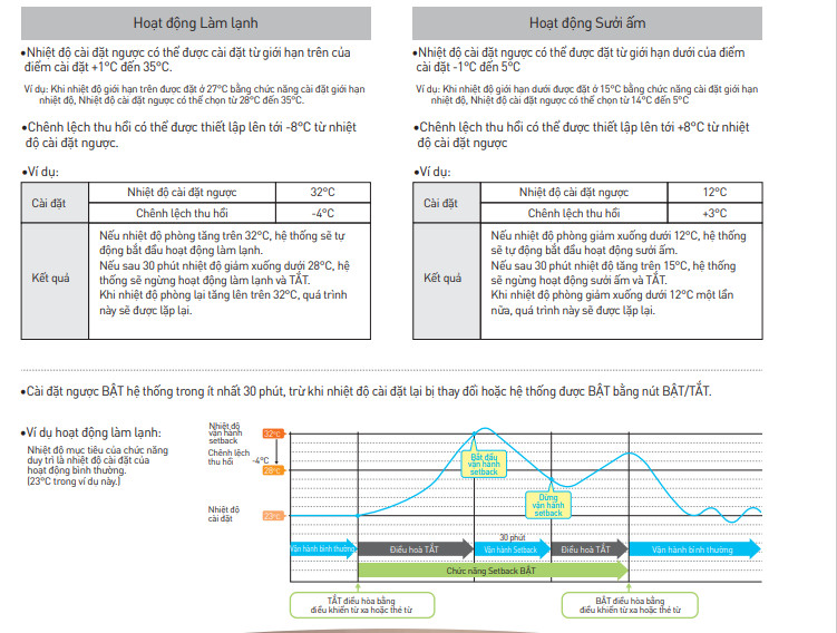 Duy trì nhiệt độ phòng trong một phạm vi cụ thể khi Tắt hệ thống ( bở người dùng hoặc hẹn giờ tắt) Để đạt được điều này, hệ thống tạm thời chạy ở chế độ vận hành làm lạnh hoặc sưởi ấm, tùy theo nhiệt độ cài đặt ngược và chênh lệch thu hồi