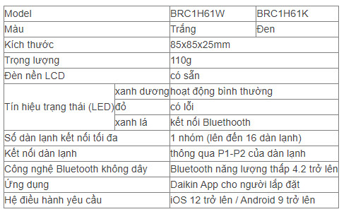 1. Thông số kỹ thuật của điều khiển từ xa có dây BTC1H61W/H